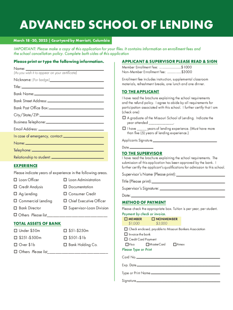 Register for the Advanced School of Lending 2025 with details on enrollment fees, experience requirements, and payment methods.