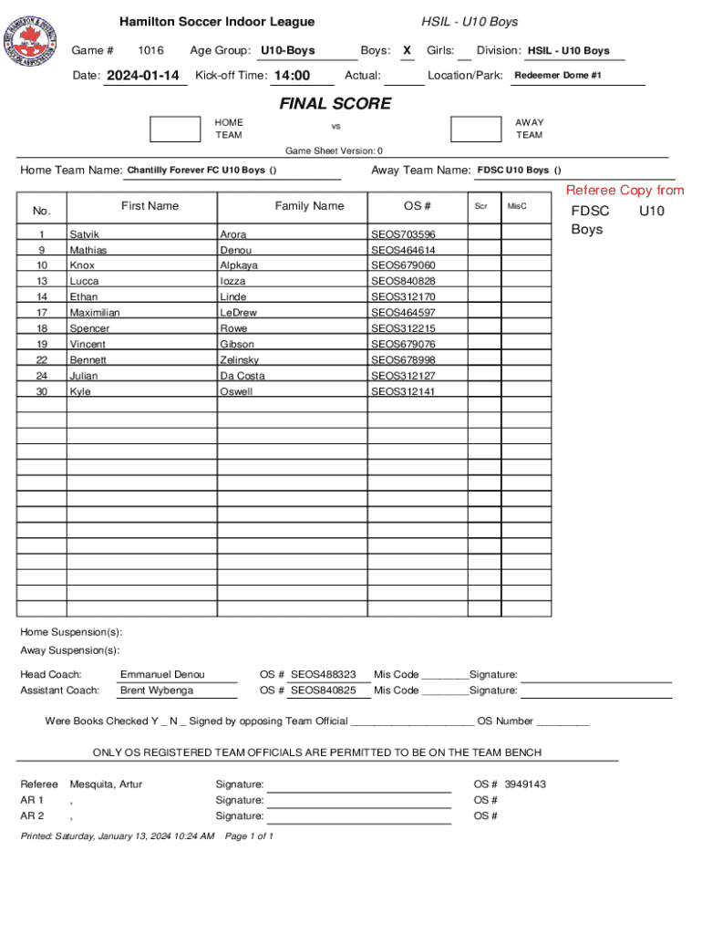 Hamilton Soccer Indoor League Game # Date:1016HSIL U10 Voyage Group: U10Boys20240114Kickoff Time:Boys:14:00Actual:Girls:Division: HAIL U10 Dislocation/Park:Redeemer Dome #1FINAL SCORE HOME TEARAWAY