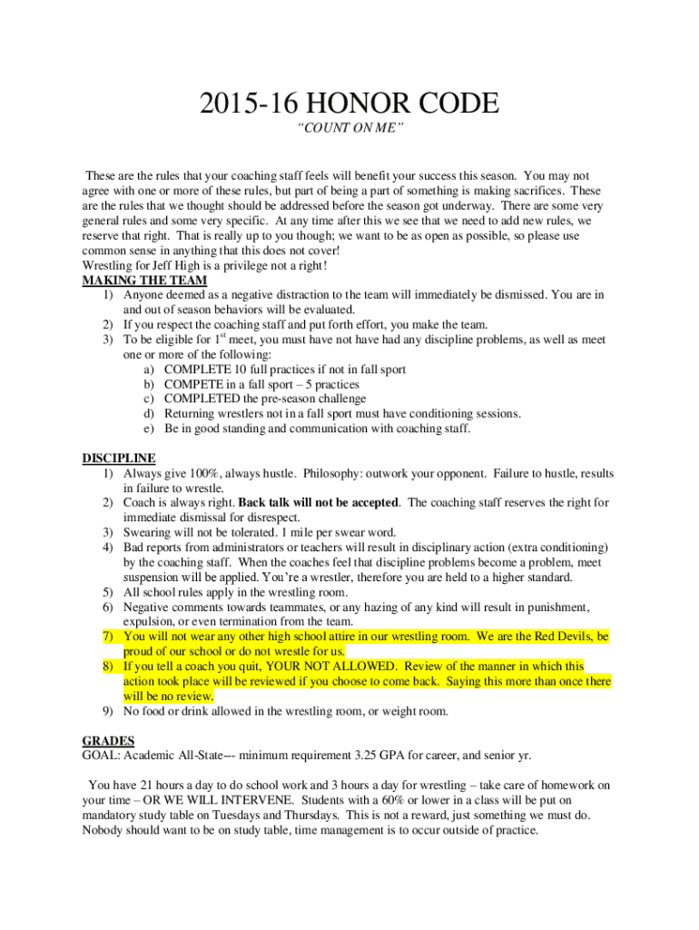 201516 HONOR CODE COUNT ON These are the rules that your coaching staff feels will benefit your success this season. You may not agree with one or more of these rules, but part of being a part of