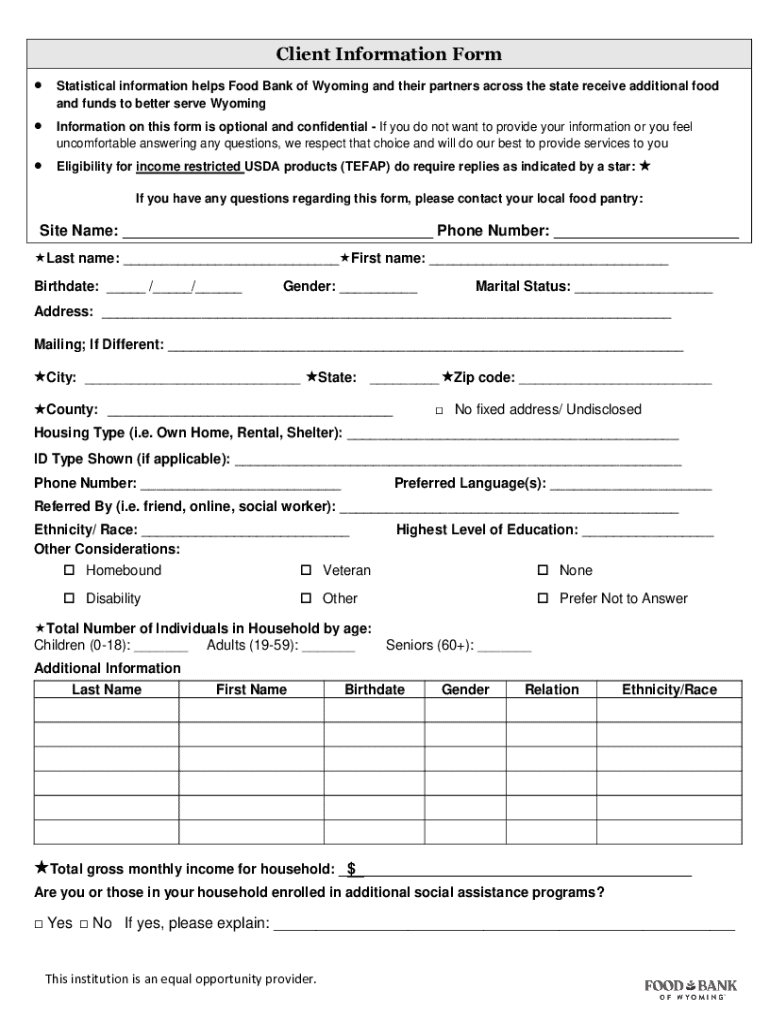 Client Information Form Statistical information helps Food Bank of Wyoming and their partners across the state receive additional food and funds to better serve Wyoming Information on this form is