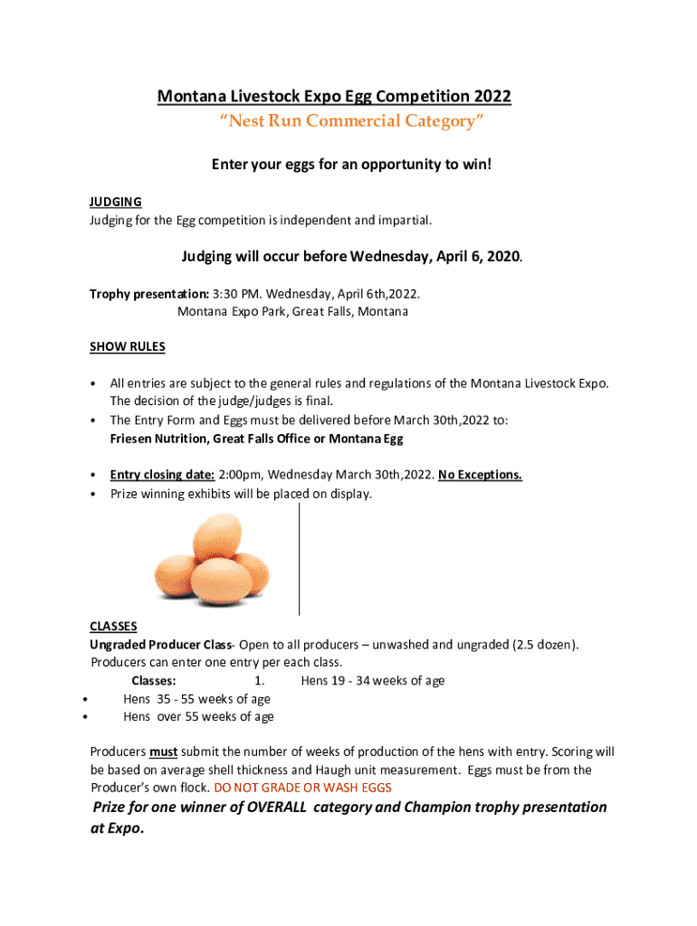 Montana Livestock Expo Egg Competition 2022 Nest Run Commercial Category Enter your eggs for an opportunity to win! JUDGING Judging for the Egg competition is independent and impartial.Judging will