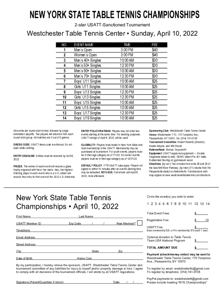 2star USATTSanctioned TournamentWestchester Table Tennis Center Sunday, April 10, 2022,