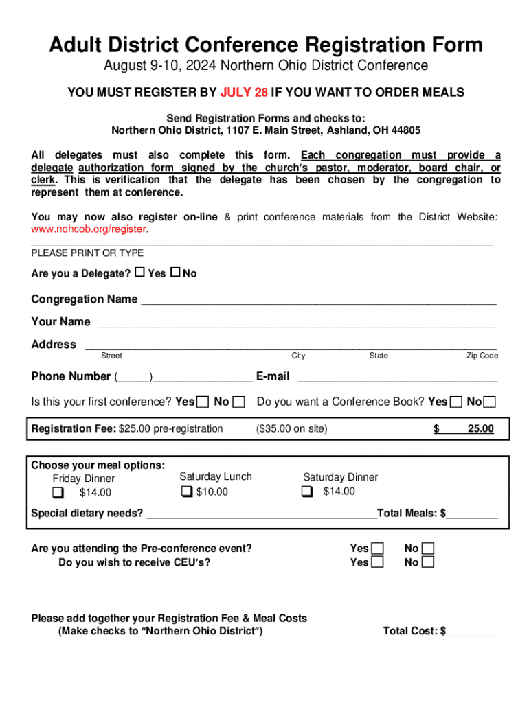 Adult District Conference Registration Form August 910, 2024 Northern Ohio District Conference YOU MUST REGISTER BY JULY 28 IF YOU WANT TO ORDER MEALS Send Registration Forms and checks to: Northern