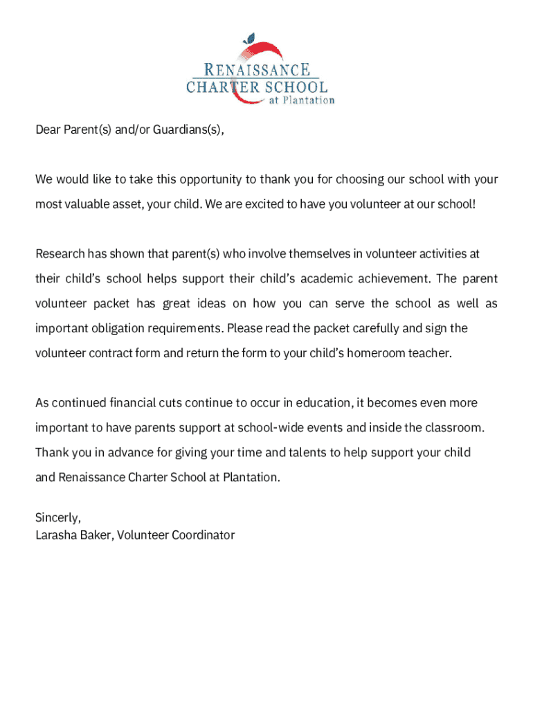 Dear Parent(s) and/or Guardians(s),We would like to take this opportunity to thank you for choosing our school with your most valuable asset, your child. We are excited to have you volunteer at our