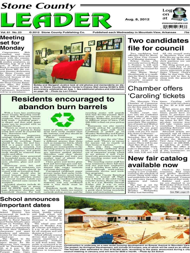 Stone County Aug. 8, 2012Log on at stonecountyleader.common. 61 No. 23 2012 Stone County Publishing Co. Published each Wednesday in Mountain View, ArkansasMeeting set for Monday Congressman Rick Crawford