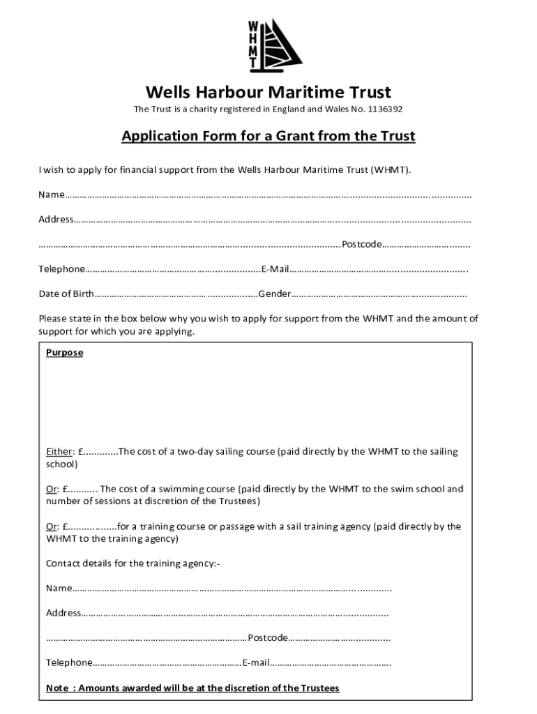 Wells Harbour Maritime Trust The Trust is a charity registered in England and Wales No. 1136392Application Form for a Grant from the Trust I wish to apply for financial support from the Wells Harbour