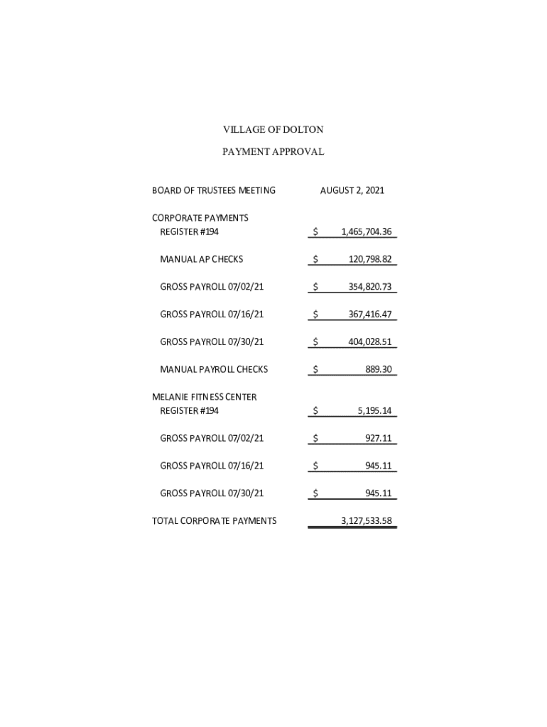 VILLAGE OF DOLTON PAYMENT APPROVALBOARD OF TRUSTEES MEETINGAUGUST 2, 2021CORPORATE PAYMENTS REGISTER #194$1,465,704.36MANUAL AP CHECKS$120,798.82GROSS PAYROLL 07/02/21$354,820.73GROSS PAYROLL 07/16/21$367,416.47GROSS