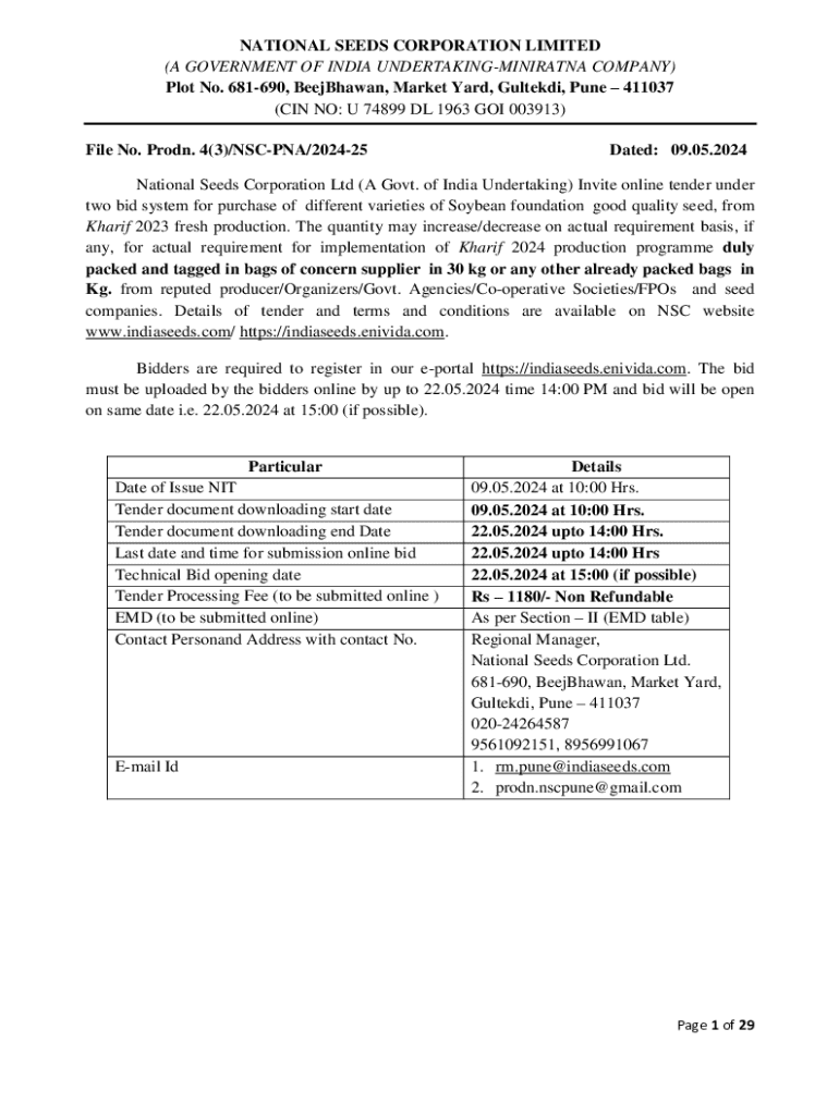 NATIONAL SEEDS CORPORATION LIMITED (A GOVERNMENT OF INDIA UNDERTAKINGMINIRATNA COMPANY) Plot No. 681690, BeejBhawan, Market Yard, Gutted, Pune 411037 (IN NO: U 74899 DL 1963 GOI 003913) File No. Prod.
