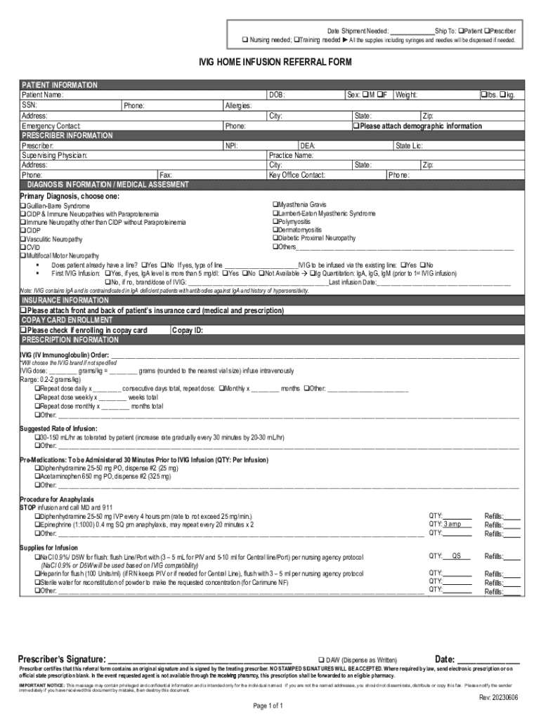 Date Shipment Needed: Ship To: Patient Prescriber Nursing needed; Training needed All the supplies including syringes and needles will be dispensed if needed.IVIG HOME INFUSION REFERRAL FORM PATIENT