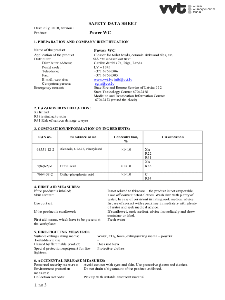 Discover the comprehensive safety data for Power WC cleaner, outlining hazards, first aid measures, and proper handling procedures for effective safety management.