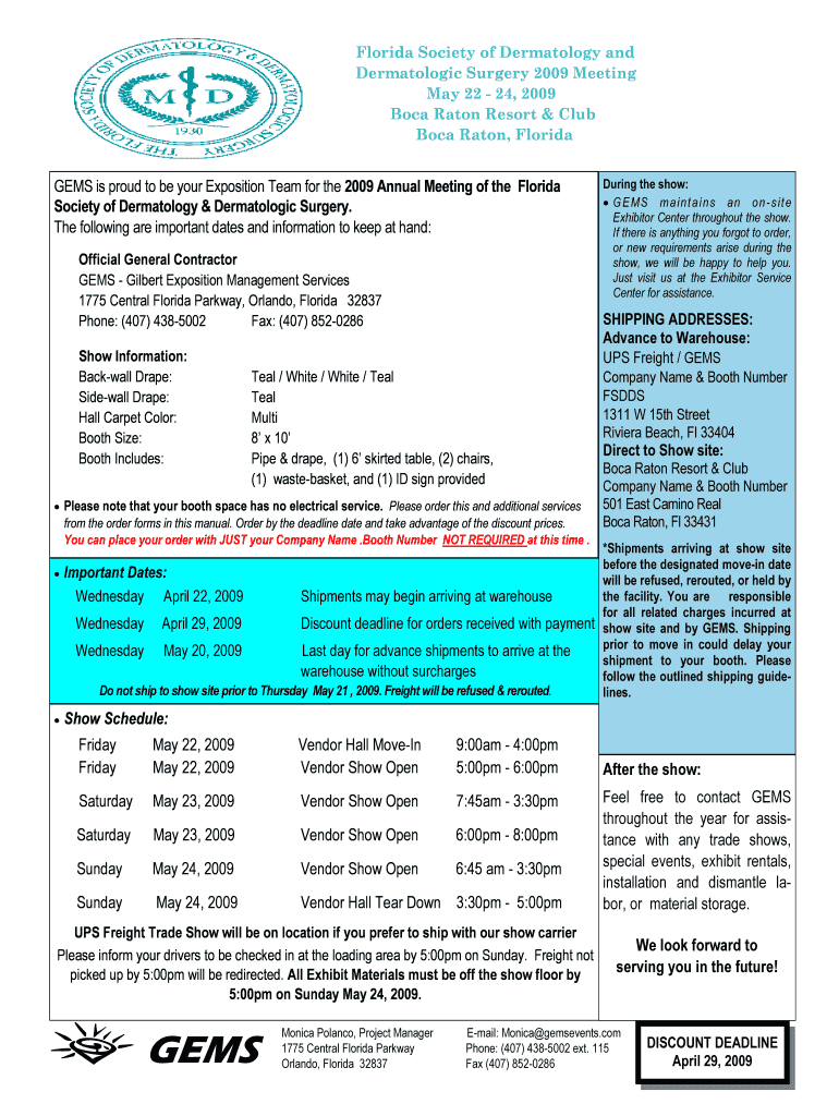 Florida Society of Dermatology and Dermatologist Surgery 2009 Meeting May 22 24, 2009 Boca Raton Resort & Club Boca Raton, Florida GEMS is proud to be your Exposition Team for the 2009 Annual Meeting