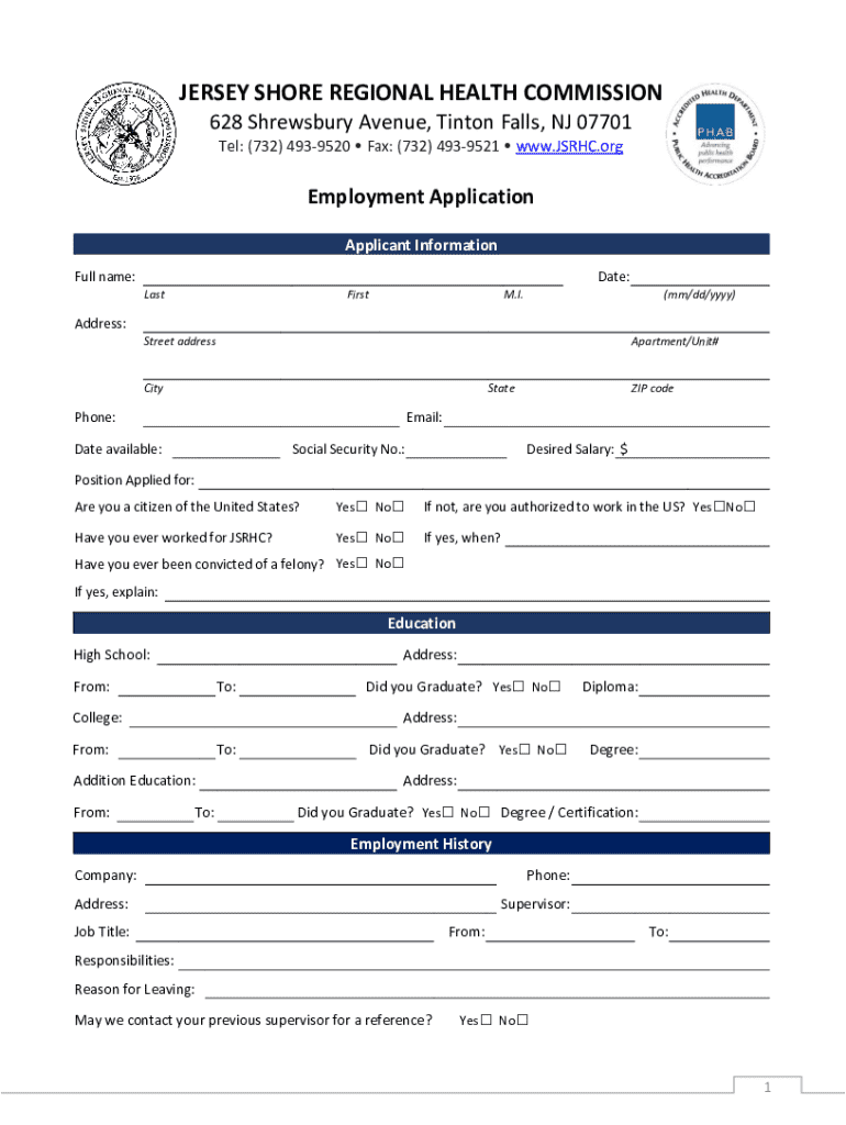 Complete the Employment Application for Jersey Shore Regional Health Commission. Provide personal info, education, and work history for job consideration.