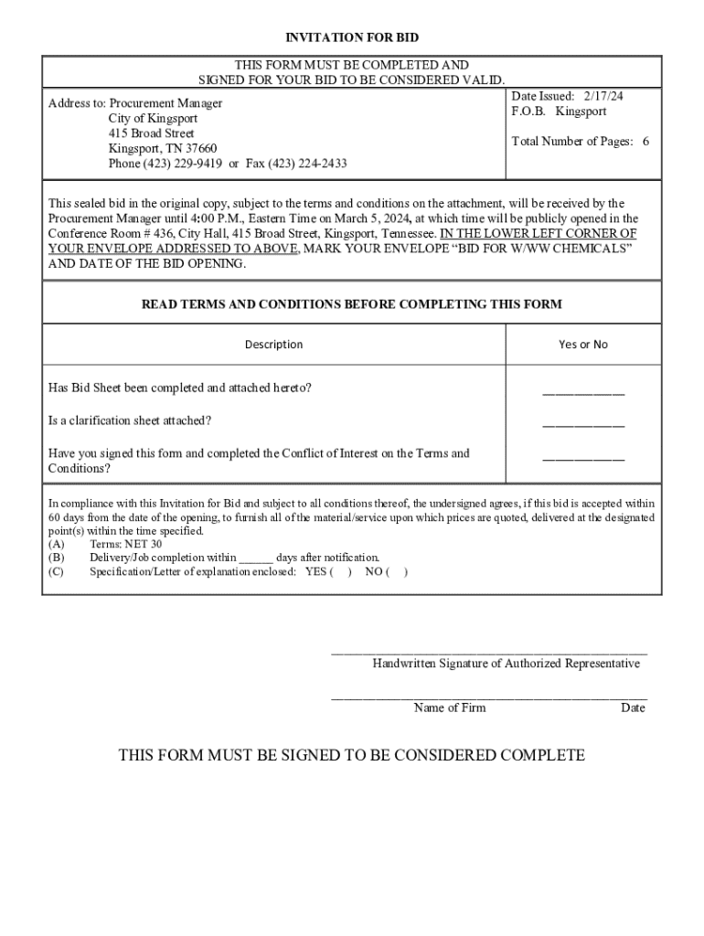 INVITATION FOR BID THIS FORM MUST BE COMPLETED AND SIGNED FOR YOUR BID TO BE CONSIDERED VALID. Address to: Procurement Manager City of Kingsport 415 Broad Street Kingsport, TN 37660 Phone (423) 2299419
