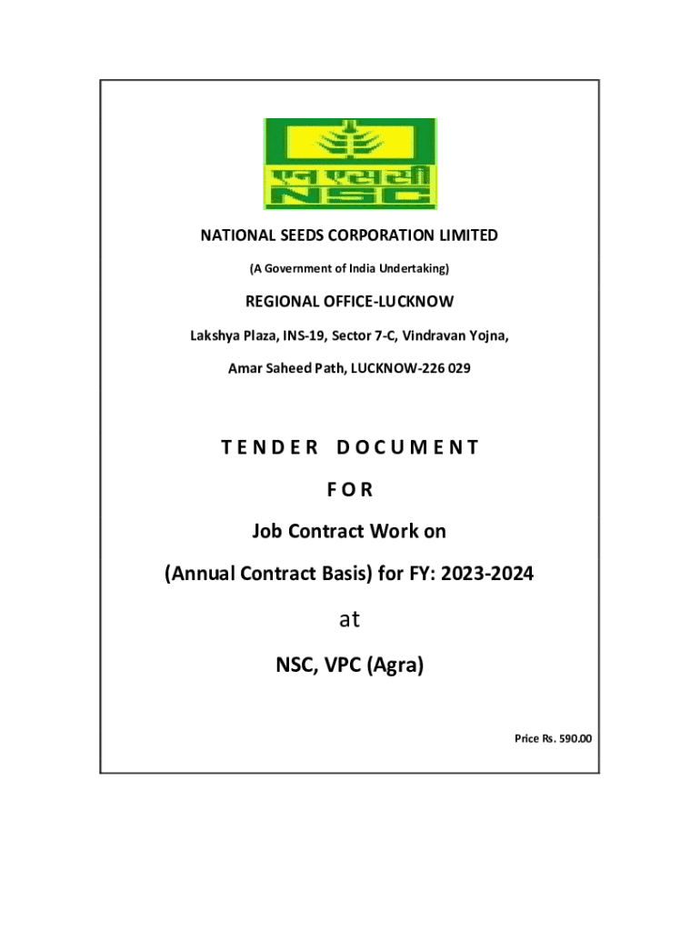 NATIONAL SEEDS CORPORATION LIMITED (A Government of India Undertaking)REGIONAL OFFICELUCKNOW Lakshya Plaza, INS19, Sector 7C, Vindravan Yojna, Amar Saheed Path, LUCKNOW226 029TENDER DOCUMENT FOR Job