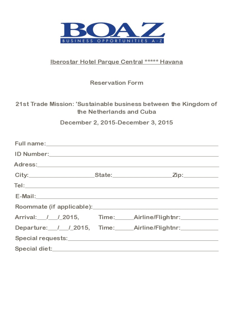 Eurostar Hotel Marque Central ***** Havana Reservation Form 21st Trade Mission: \'Sustainable business between the Kingdom of the Netherlands and Cuba December 2, 2015December 3, 2015 Full name:___