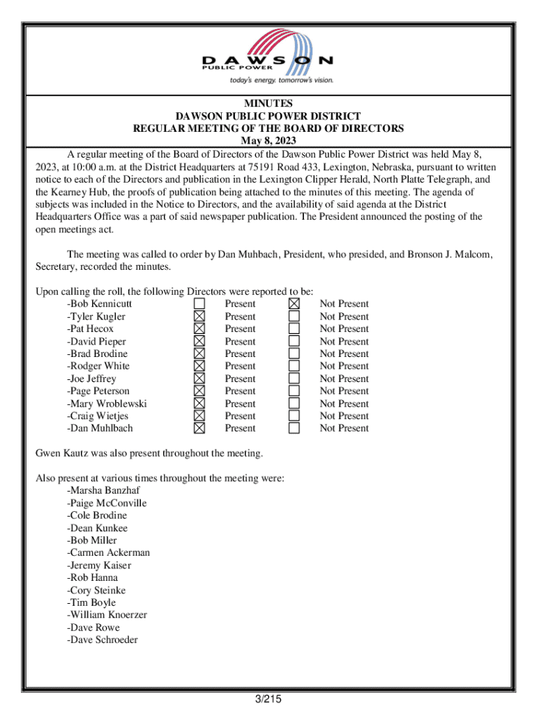 MINUTES DAWSON PUBLIC POWER DISTRICT REGULAR MEETING OF THE BOARD OF DIRECTORS May 8, 2023, A regular meeting of the Board of Directors of the Dawson Public Power District was held May 8, 2023, at
