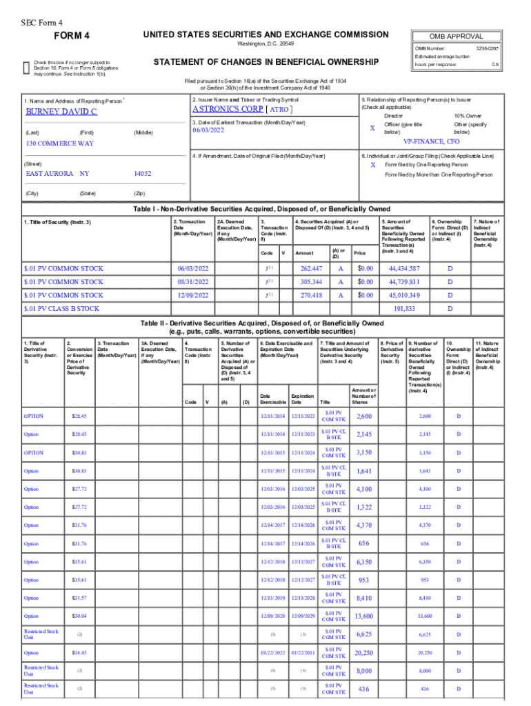This document details the changes in beneficial ownership for Astronics Corp in 2022, filed by David C. Burney, including acquisition and disposal of securities.
