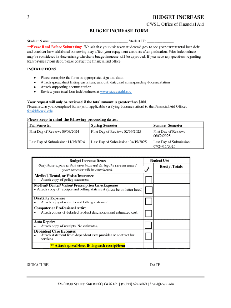 BUDGET INCREASE POLICY CWSL Office of Financial Aid POLICY INFORMATION Each school must determine a Cost of Attendance, also referred to as the \"student budget\", for each of its programs. During