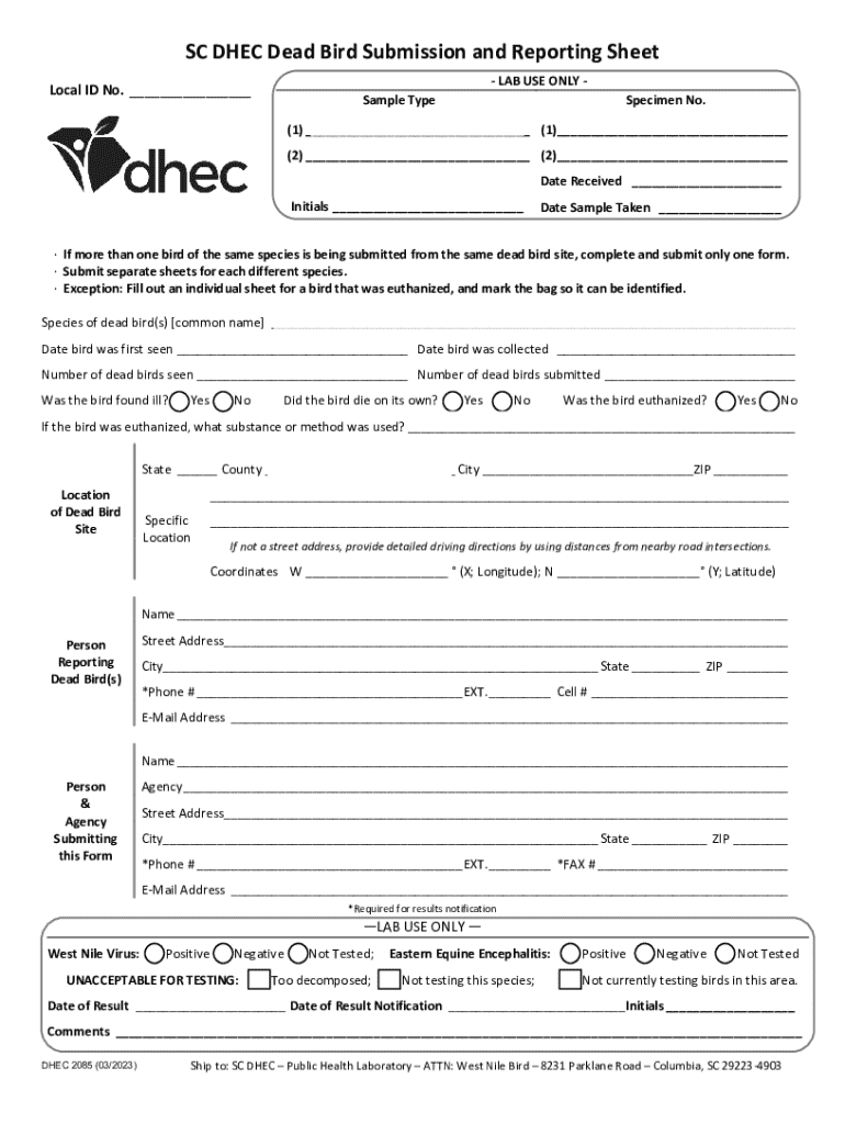 Sc Dhec Dead Bird is not the form you're looking for?Search for another form here.