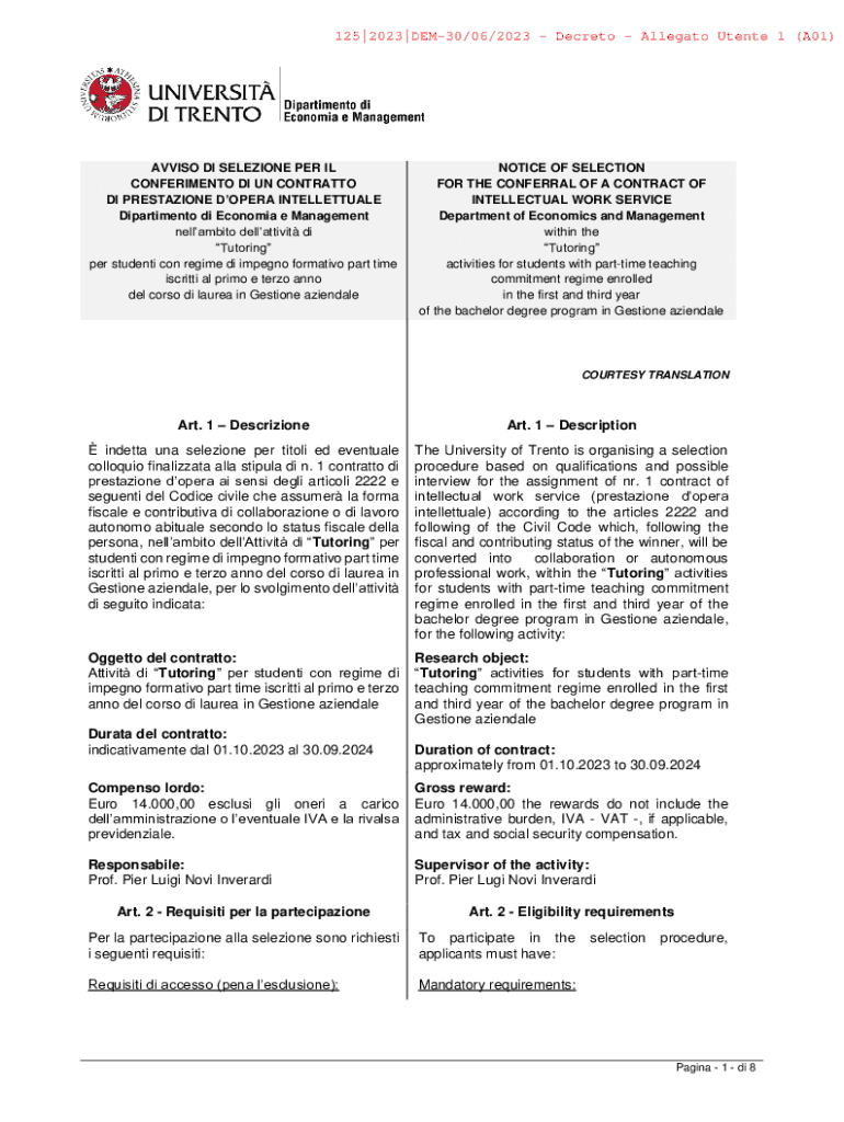 125|2023|DEM30/06/2023 Decreto Allegato Utente 1 (A01)AVVISO DI SELEZIONE PER IL CONFERIMENTO DI UN CONTRATTO DI PRESTAZIONE DOPERA INTELLETTUALE Dipartimento di Economia e Management nellambito dellattivit