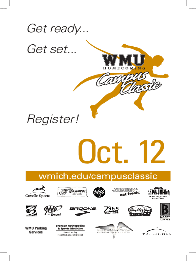 Get ready... Get set...Register!Oct. 12wmich.edu/campusclassicENTRY FORM A FORM MUST BE COMPLETED FOR EACH PERSON PARTICIPATING IN A RUN OR WALK. NO REFUNDS. NO EXCEPTIONS. Birthdate ___ (must be