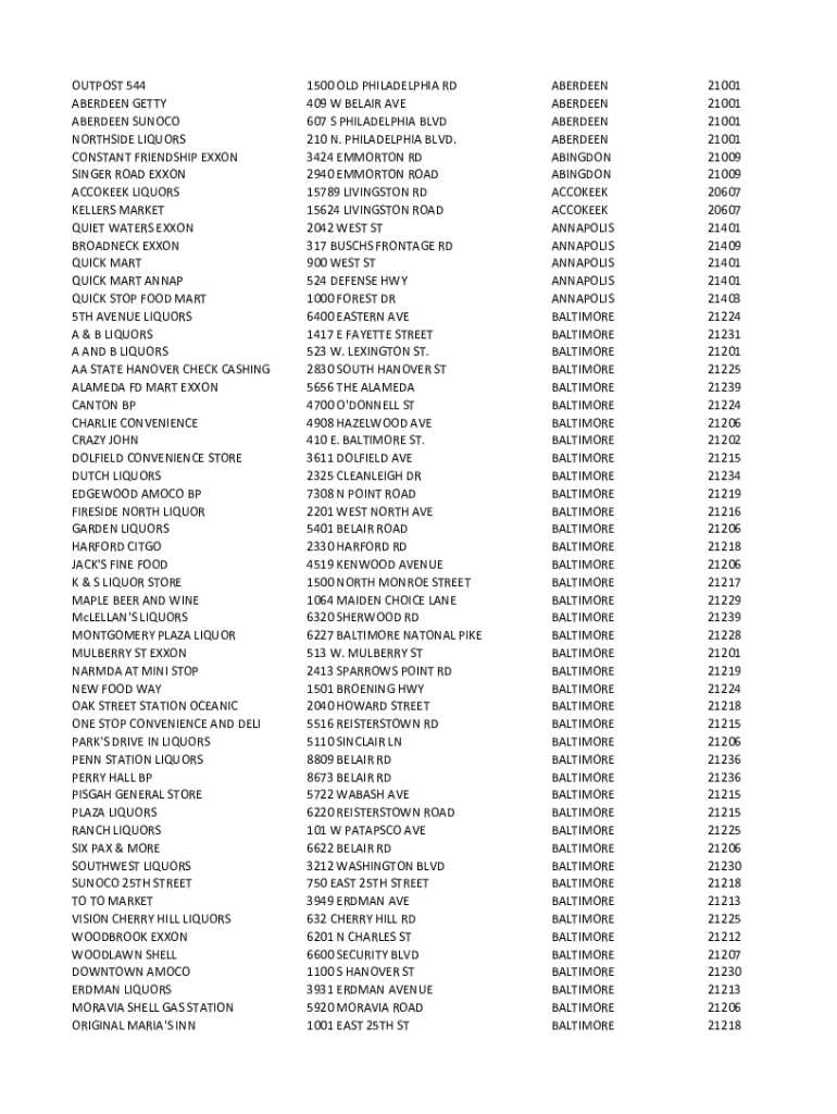 OUTPOST 544 ABERDEEN GETTY ABERDEEN SUN OCO NORTHSIDE LIQUORS CONSTANT FRIENDSHIP EXXON SINGER ROAD EXXON ACCORDED LIQUORS SELLERS MARKET QUIET WATERS EXXON BREAKNECK EXXON QUICK MART ANNA QUICK STOP