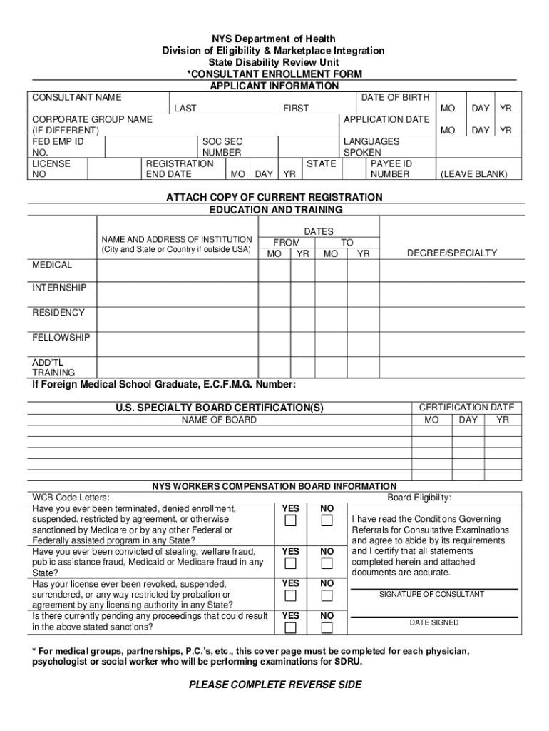 NYS Department of Health Division of Eligibility & Marketplace Integration State Disability Review Unit *CONSULTANT ENROLLMENT FORM APPLICANT INFORMATION CONSULTANT NAMEDATE OF BIRTH LASTCORPORATE