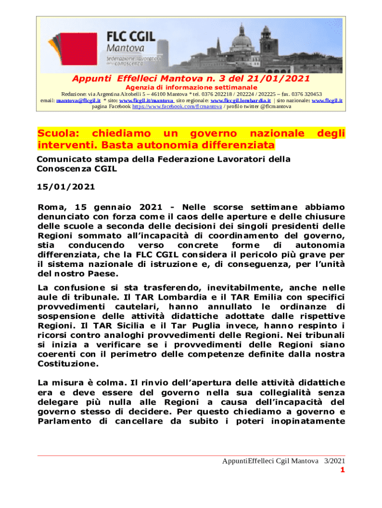Amount Effelleci Manitoba n. 3 Del 21/01/2021 Agenda DI information settimanale Relations: via Argentina Antonelli 5 46100 Manitoba * tel. 0376 202218 / 202224 / 202225 faxes. 0376 320453 email: mantova@flcgil.it