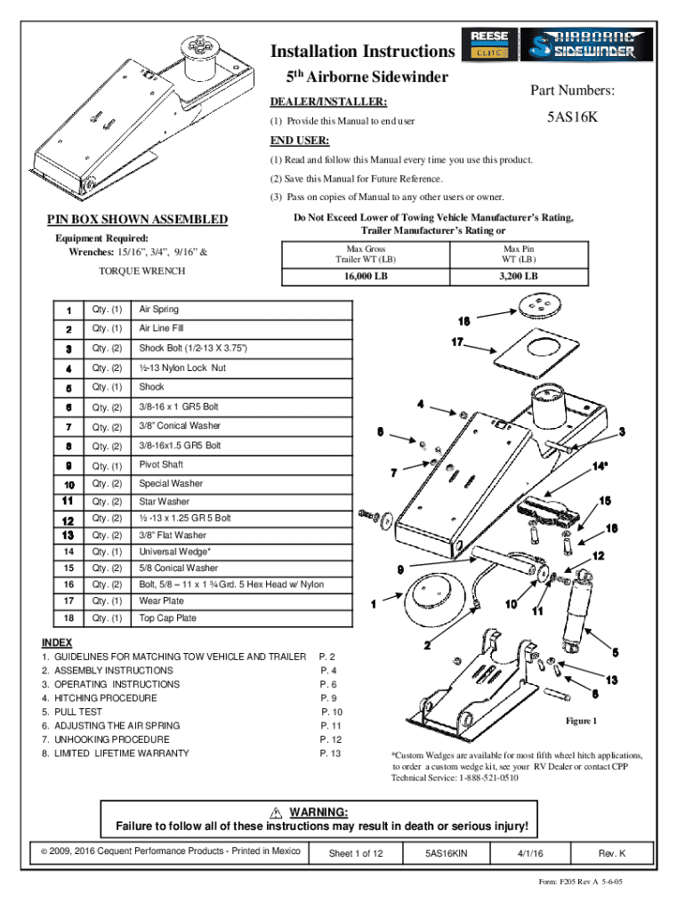 Installation Instructions 5th Airborne SidewinderPart Numbers:DEALER/INSTALLER:5AS16K(1) Provide this Manual to end user END USER: (1) Read and follow this Manual every time you use this product.