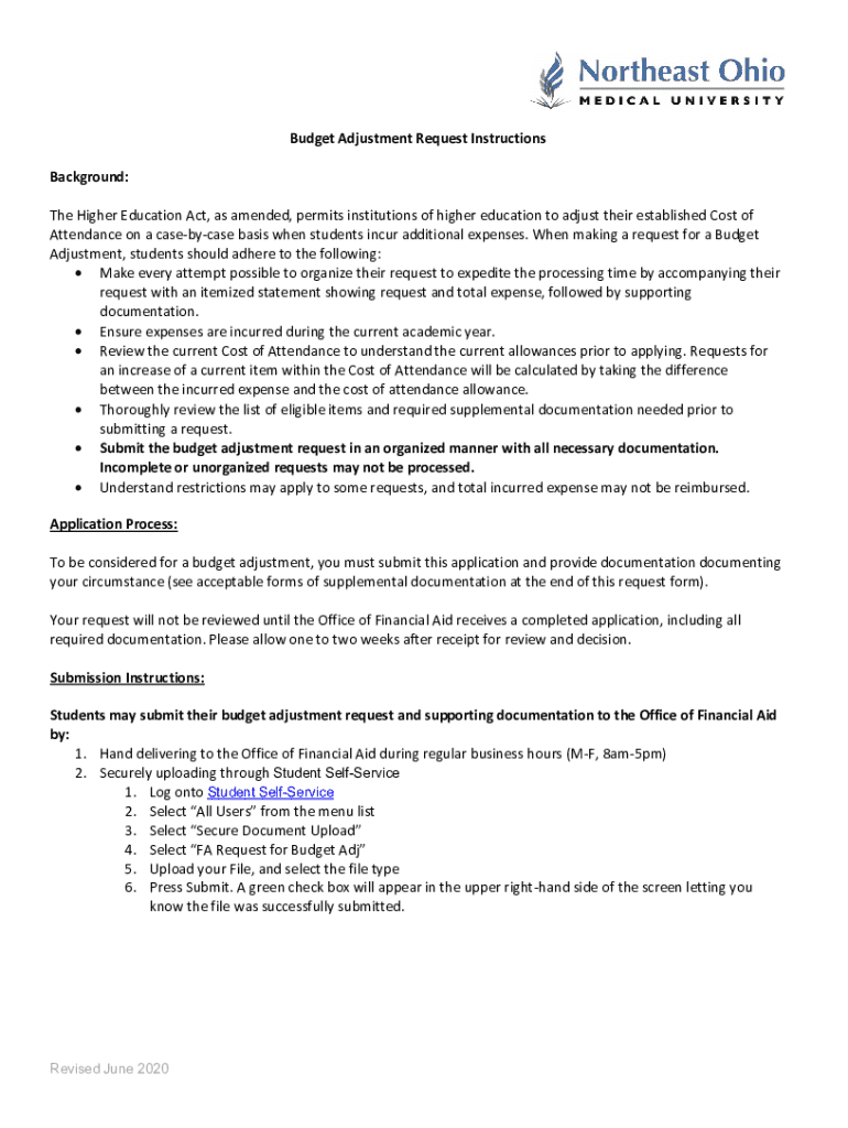 Budget Adjustment Request Instructions Background: The Higher Education Act, as amended, permits institutions of higher education to adjust their established Cost of Attendance on a casebycase basis