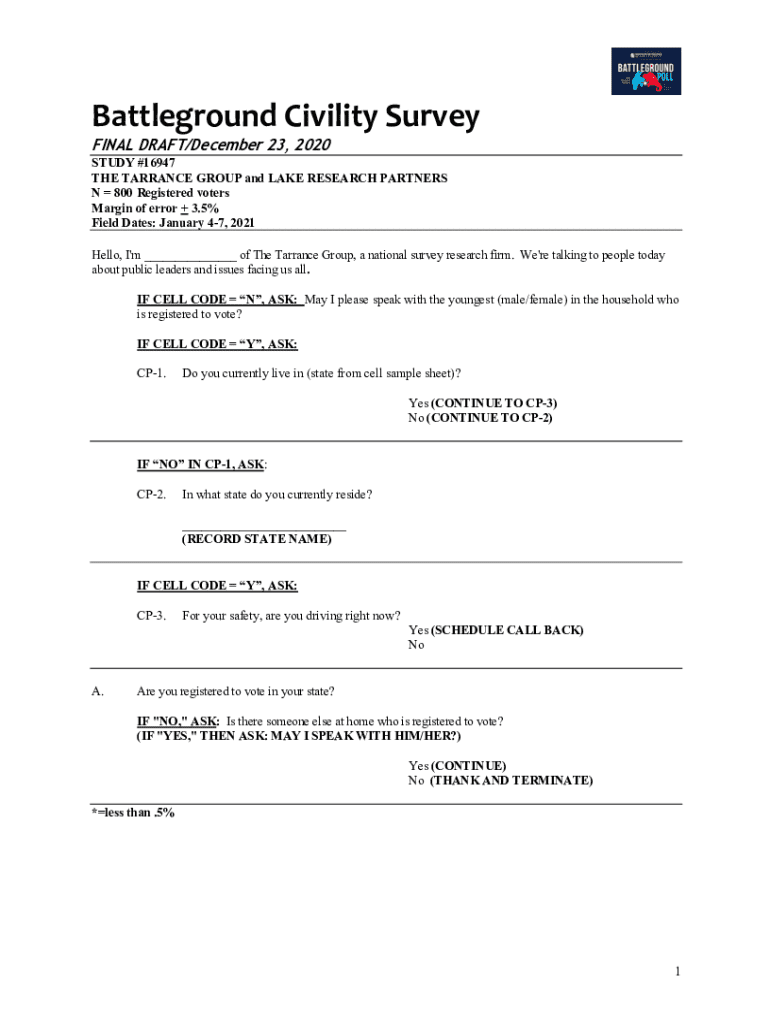 Battleground Civility Survey FINAL DRAFT/December 23, 2020STUDY #16947 THE TARRANCE GROUP and LAKE RESEARCH PARTNERS N 800 Registered voters Margin of error + 3.5% Field Dates: January 47, 2021 Hello,