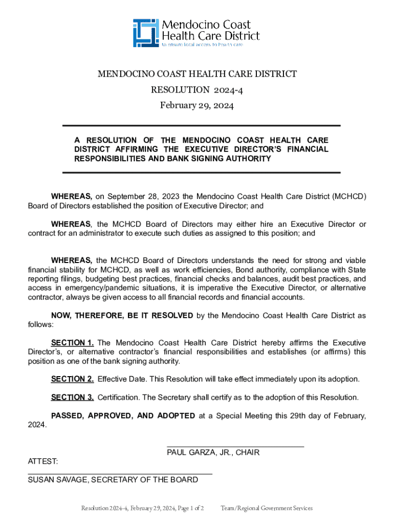 This resolution affirms the Executive Director\'s financial responsibilities and bank signing authority for the Mendocino Coast Health Care District as of February 29, 2024.