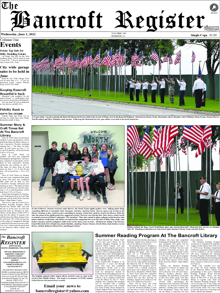 The Bancroft RegisterSpecial Baseball Edition Bancroft Register Wednesday, May 30, 2018ncroft Memorial Park turns 70!VOLUME 140 NUMBER 22Wednesday, June 1, 2022Column OneEventsSpec Based EditiSingle