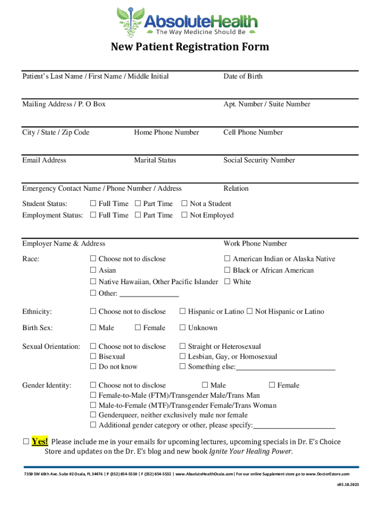 Obtain a new patient registration form from the healthcare provider's office or website.