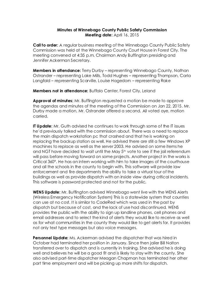 Minutes of Winnebago County Public Safety Commission Meeting date: April 16, 2015, Call to order: A regular business meeting of the Winnebago County Public Safety Commission was held at the Winnebago