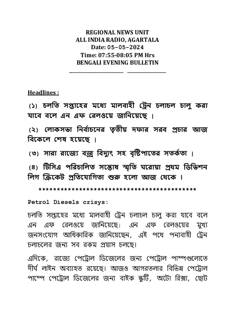 REGIONAL NEWS UNIT ALL INDIA RADIO, AGARTALA Date: 05052024 Time: 07:5508:05 PM Hrs BENGALI EVENING BULLETIN ___ ___ Headlines : () | ()