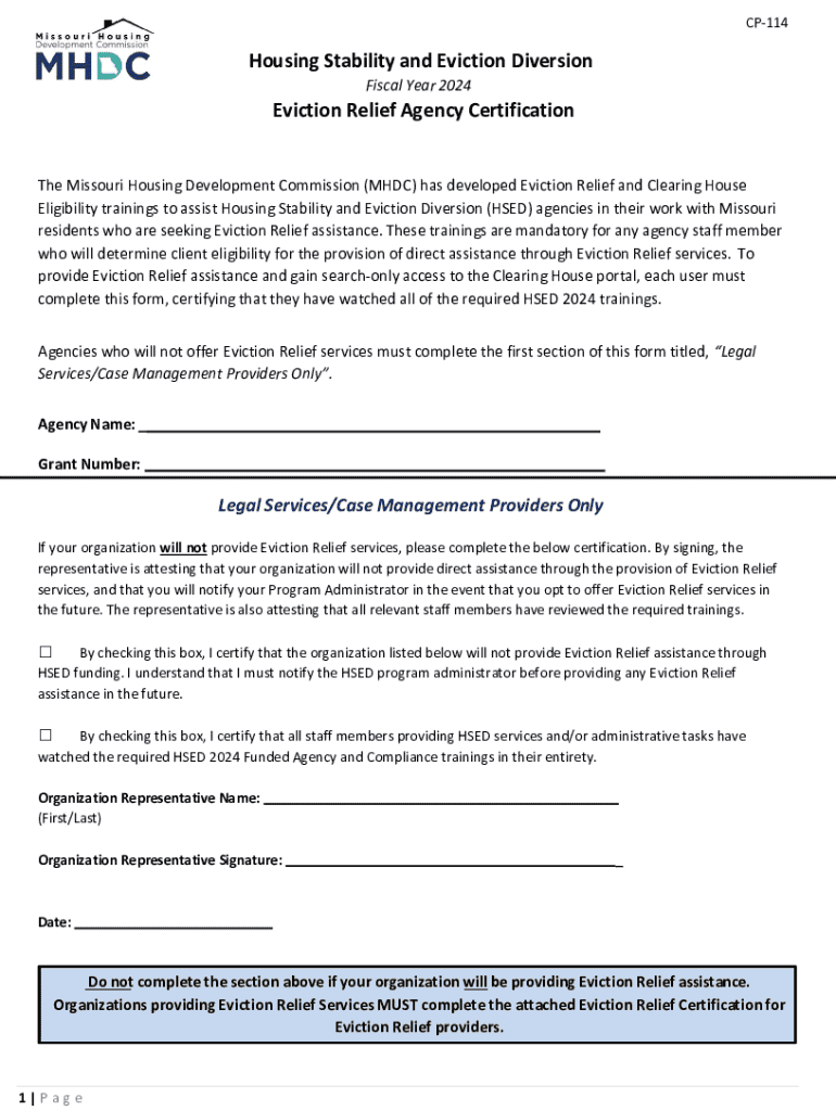 CP114Housing Stability and Eviction Diversion Fiscal Year 2024Eviction Relief Agency Certification The Missouri Housing Development Commission (MHDC) has developed Eviction Relief and Clearing House