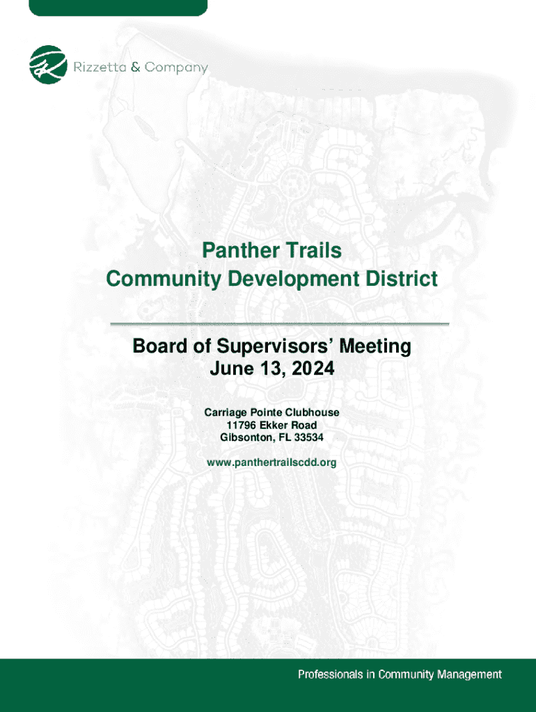 Panther Trails Community Development District Board of Supervisors Meeting June 13, 2024, Carriage Point Clubhouse 11796 Ever Road Gibson ton, FL 33534 www.panthertrailscdd.orgPANTHER TRAILS COMMUNITY