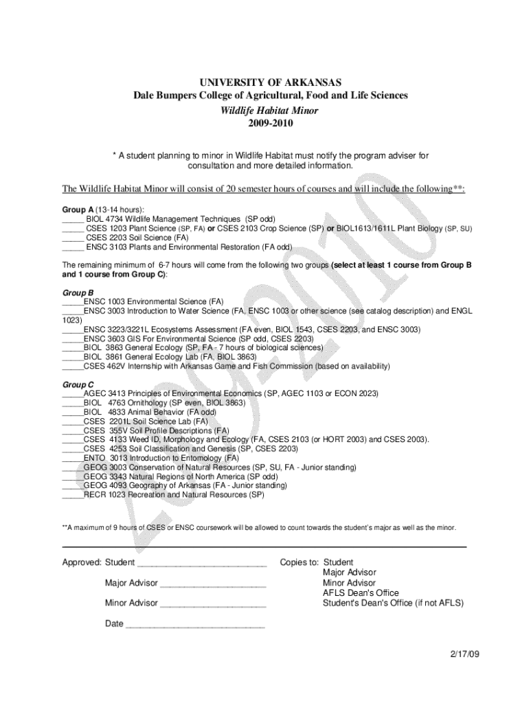 UNIVERSITY OF ARKANSAS Dale Bumpers College of Agricultural, Food and Life Sciences Wildlife Habitat Minor 20092010 × A student planning to minor in Wildlife Habitat must notify the program adviser