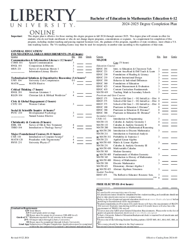Bachelor of Education in Mathematics Education 612 20242025 Degree Completion Plan Important:This degree plan is effective for those starting this degree program in fall 2024 through summer 2025.