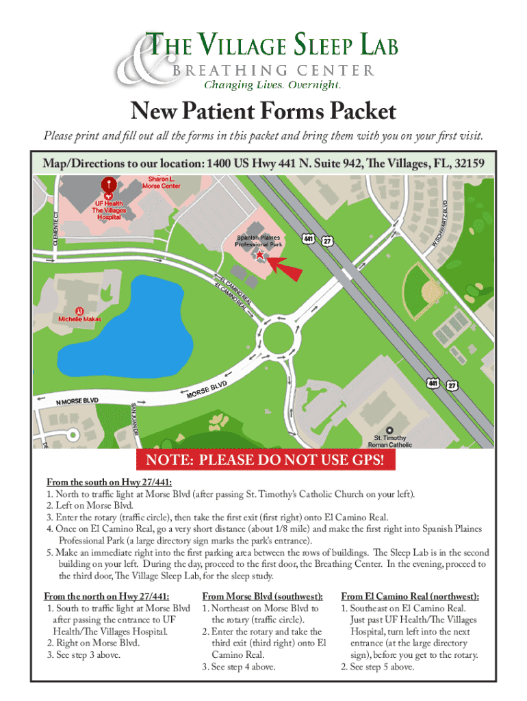 New Patient Forms PacketPlease print and fill out all the forms in this packet and bring them with you on your first visit. Map/Directions to our location: 1400 US Hwy 441 N. Suite 942, The Villages,