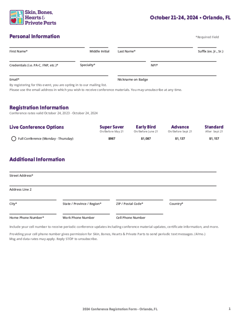 October 2124, 2024 Orlando, FL Personal Information×Required Fielders Name×Middle Initially Name×Suffix (ex. Jr., Sr.) Specialty*Credentials (i.e. PAC, FDP, etc.)*NPI×Email×Nickname on Badge
