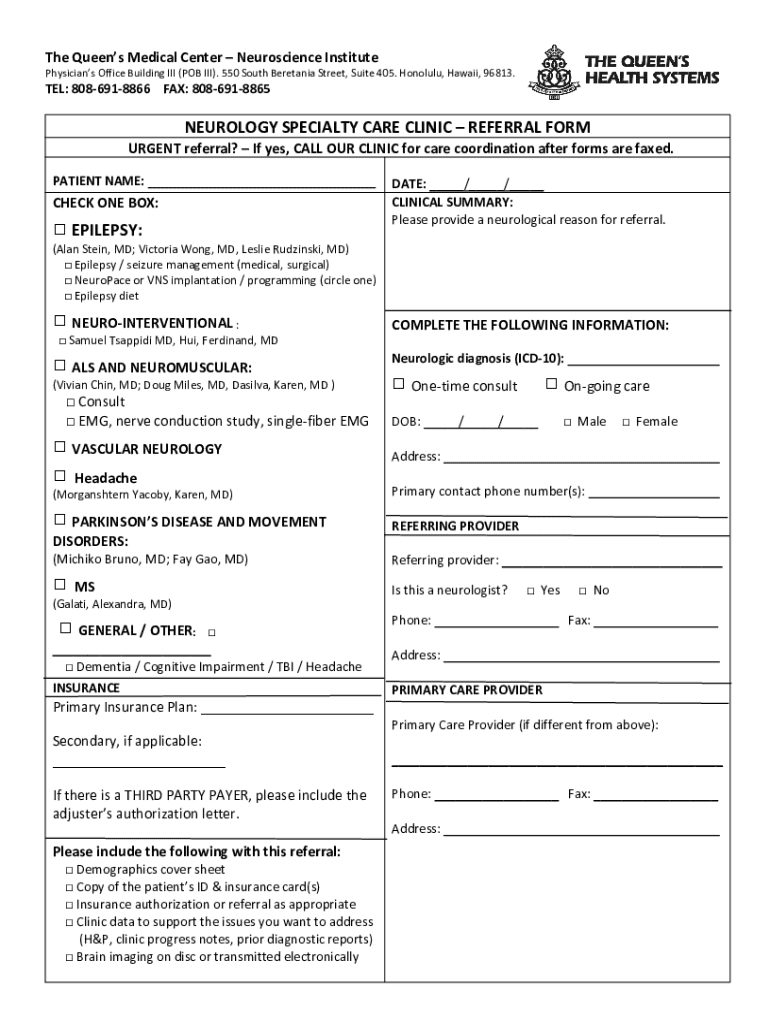 The Queens Medical Center Neuroscience Institute Physicians Office Building III (POB III). 550 South Batavia Street, Suite 405. Honolulu, Hawaii, 96813.TEL: 8086918866 FAX: 8086918865NEUROLOGY SPECIALTY