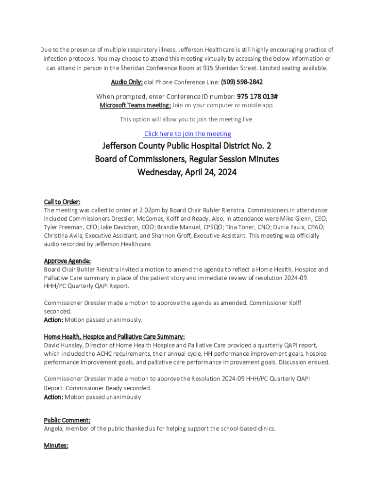 Due to the presence of multiple respiratory illness, Jefferson Healthcare is still highly encouraging practice of infection protocols. You may choose to attend this meeting virtually by accessing