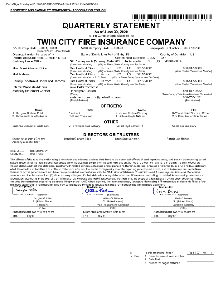 DocuSign Envelope ID: 59BAD0BF50DC4AC9A52C61304D788D62PROPERTY AND CASUALTY COMPANIES ASSOCIATION EDITION×29459202020100102*QUARTERLY STATEMENT As of June 30, 2020, of the Condition and Affairs of