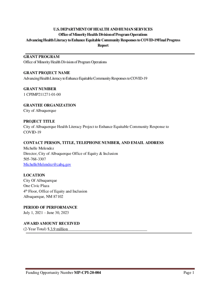 U.S. DEPARTMENT OF HEALTH AND HUMAN SERVICES Office of Minority Health Division of Program Operations Advancing Health Literacy to Enhance Equitable Community Responses to COVID19Final Progress Report