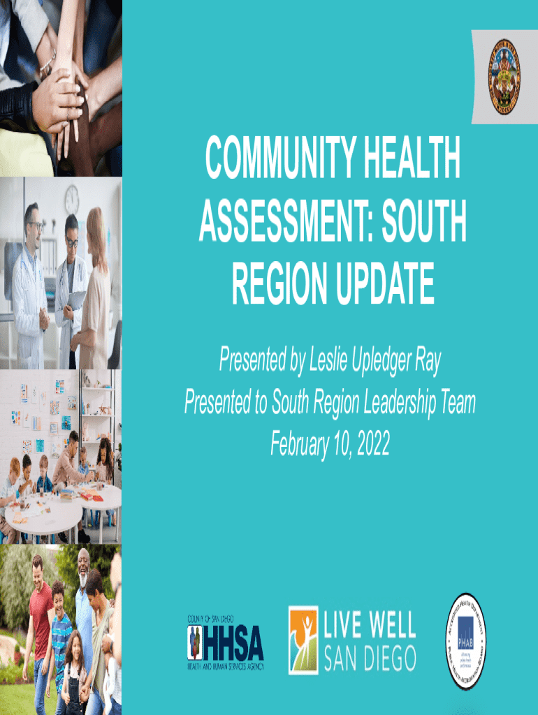 COMMUNITY HEALTH ASSESSMENT: SOUTH REGION UPDATE Presented by Leslie Upledger Ray Presented to South Region Leadership Team February 10, 2022PURPOSE AND AGENDA PURPOSE: SHARE AND RECEIVE INFORMATION