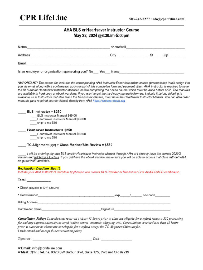 CPR LifeLine5032432277 info@cprlifeline.comAHA BLS or Heartsaver Instructor Course May 22, 2024 @8:30am5:00pm Name___ phone/cell___ Address___ City___ St___ Zip___ Email___ Is an employer or organization
