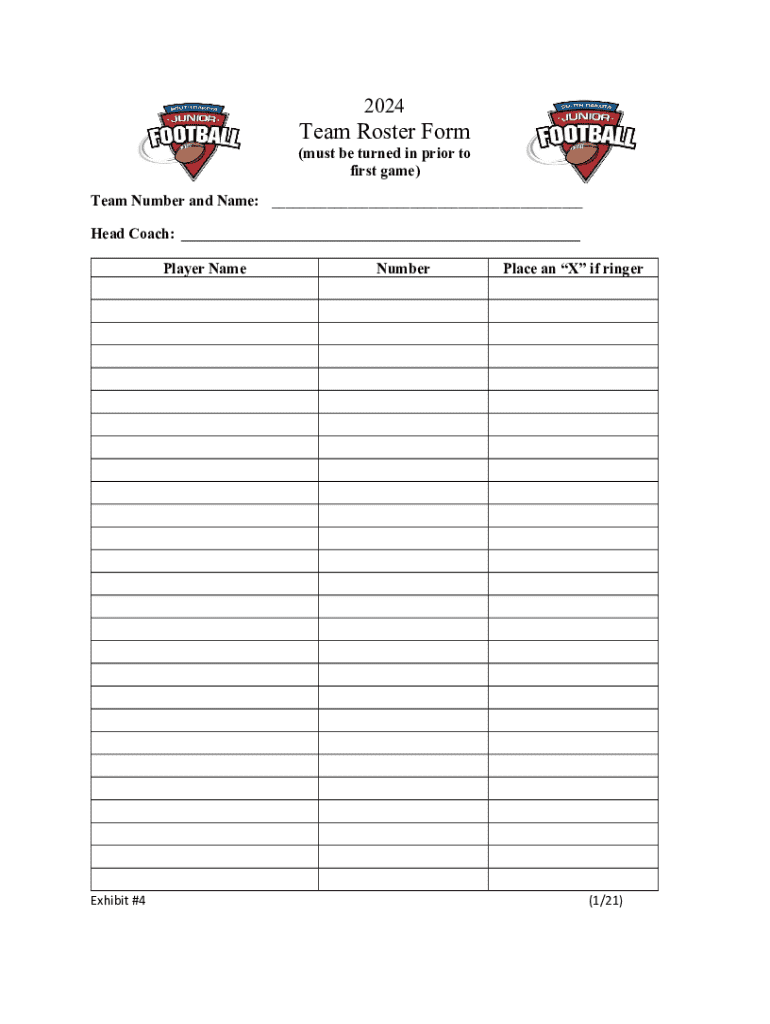 2024Team Roster Form (must be turned in prior to first game) Team Number and Name: ___ Head Coach: ___ Player NameExhibit #4NumberPlace an X if ringer(1/21)