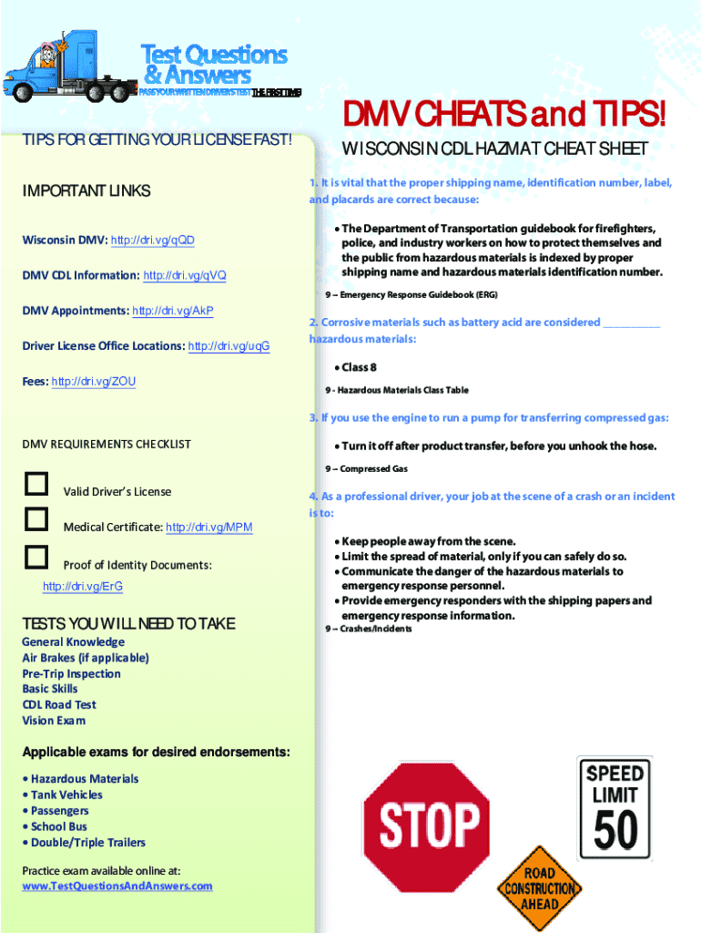 TIPS FOR GETTING YOUR LICENSE FAST! IMPORTANT LINKS Wisconsin DMV: http://dri.vg/qQD DMV CDL Information: http://dri.vg/qVQDMV CHEATS and TIPS! WISCONSIN CDL HAZMAT CHEAT SHEET1. It is vital that